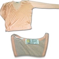 Long sleeved wool and rayon peach coloured vest, possibly a pyjama top. The vest has a decorative lace trim around the yoke and cuffs, there are belt loops at the waist but the belt is missing. There is a fabric label at the waist which reads 'Smedley's Nightwear wool & rayon Trimming excepted MADE IN ENGLAND'