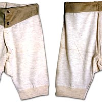 A man's trunks in unbleached wool with a waistband of khaki cotton sateen which fastens with two plastic buttons. Each leg is made in one piece and they are seamed at the centre back. There are applied straps for the ends of braces to go through before they button to the trousers. The trunks are stamped with 'Druid Regd, 1943, Warnorm, G.I. size 3 4' and the broad arrow signifying that they were made under Government order for the armed services.