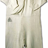 These combinations for a man have crossover sloped fronts, creating a V neck, and short sleeves. There is a flap at the left centre back and an opening at centre front. The legs which stop at mid thigh have ribbed cuffs.