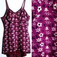 A woman's bathing costume in purple wool with a Jacquard pattern of daisies and bell flowers in black and white. One main front piece and one main back piece forming a short tight skirt. The plain purple knicker section is seamed into the waist. The bust pieces are cut separately and seamed in. The shoulder straps extend to pass through loops at the low U shaped back to tie at the centre back. There is a woven label 'Simpson Piccadilly'.
