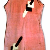 A bathing costume in orange cotton interlock piped at the neck and armhole edges in black. The black and yellow Art Deco decoration is applied. The costume is made in two pieces with a lozenge shaped gusset at the crotch. It fastens with a button on the left shoulder and is labelled 'Meridian interlock, the perfect fabric for sensitive skins'.