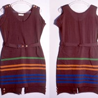 A bathing costume in brown wool with bands of colour. The costume is knitted with a front and back, U shaped neck and fastens with three plastic buttons and buttonholes on both shoulders. The armholes have ovals of plain brown knit sewn in at the bottom. Bands of green, orange and blue decorate the bottom of the skirt which partially covers the sewn in drawers which themselves fasten on the outside of the leg with two plastic buttons. The costume has the printed label 'The Ocean Bathing Suit Co, New York' and comes from the former premises of Meridian. It is likely that this, and others now in the museum's collection, were obtained for research purposes.