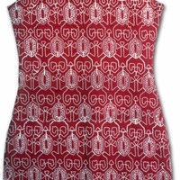 A bathing costume in scarlet wool machine embroidered in white cotton with a diaper of hexagons. The suit is made with a back and V necked front in embroidered wool and fastens with press studs on the left shoulder. The skirt partially covers drawers of plain stockinet which are sewn in at low waist level. Inside is the label 'The Ocean Bathing Suit Co, New York' and comes from the former premises of Meridian Ltd. It is likely that this, and others now in the museum's collection, were obtained for research purposes.