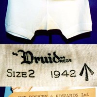 Wartime woman's drawers in wool and rayon stockinet. Each leg is in one piece with a knitted cuff. The waist is elasticated and there is a square crotch gusset. The drawers are marked in black ink with '"Druid" Regd. Size 2 1942' and the broad arrow. They also have a manilla tie-on label printed with 'Drewry & Edwards Ltd, Carriage Paid, Nottingham' and type written with 'Contract 292/CK/N20/9 Pantees A.T.S. Patt.11826 Duplicate of sample confirmed 15.1.42'. These were for women's wear in the army. A.T.S. stands for Auxiliary Territorial Service .