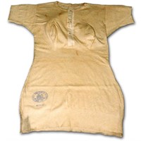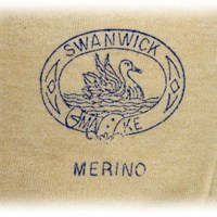 Ladies' cream wool long vest with short sleeves and bust shaping. The letter 'E' is worked into the garment on the front right hip. There is a washable blue ink stamp outside the vest of a swan within an oval shape. These combinations are on loan to the museum.