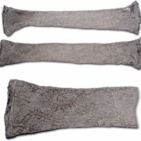 Pair of elbow length mittens, grey rayon knitted in an openwork pattern. Label ALL RAYON MADE IN ENGLAND.