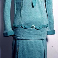 A woman's suit consisting of a jumper top and skirt in a mixture of wool and rayon. The jumper has long sleeves and two patch pockets with plain green wool tops. Around the V neck is a simulated scarf of green wool, the ends passing through a pearl slide, and there is another strip and slide at the low waist. The mixture skirt is sewn to a white cotton yoke with elastic tape at the waist.