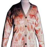 A women's cardigan-jacket in orange, grey, pink and white silk (or rayon) machine knitted using a double knit construction and the Jacquard apparatus. The long sleeves have grey ribbed cuffs and there is a band of knitting around the neck and front edges. The jacket fastens with five grey pearl buttons and buttonholes and has two pockets.