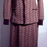 A jacket and skirt in wool with a Jacquard pattern of broken zigzags in three shades of brown. The jacket has a V neck and long sleeves. The front and neck edges and the ribbed turn-back cuffs are in plain brown wool. On each front is a single pocket. The jacket fastens with four plastic buttons and buttonholes. The long skirt has four panels of unequal width and an elasticated waist.