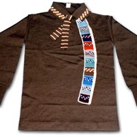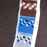 Brown cashmere pullover, long sleeved with checked collar and striped tie in brown, orange and white. Style 025, one of many similar designs with slight variations in collar and tie. Factory sample with 10 colour swatches attached (this is dark oak).