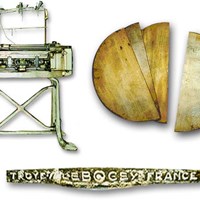 This machine used latch needles on a flat bed to produce berets. The shape of the beret was controlled by a shaping drum that runs along the length of the machine. The berets were placed on wooden boards to provide a final shape. The machine was manufactured in Troyes, a major centre for the French knitting industry.