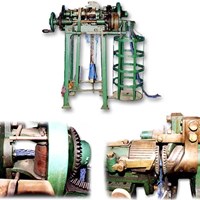 A circular purl barrel machine with double ended bearded needles in horizontal double cylinders. The machine was used for making gaiters for the armed forces.