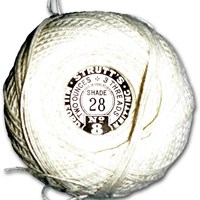 Ball of knitting cotton marked 'Strutt's / two ounces, 3 threads, shade 28, no.8'.