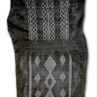 Black silk rectangle with lozenge patterns in lace stitch, received with the information "Made on German lace machine 1908" from Allen, Solly & Co Ltd.