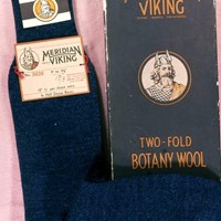 Man's circular knitted socks in blue and black marled wool in their original box. They have deep ribbed cuffs and are stamped in green and white on the sole 'Two-fold Botany Wool, Meridian Viking Regd, Made in England' and in white on the toes 'Wartime Weight'.