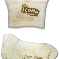 One of two pairs of white stockings, unworn, the stockings have a cardboard label stapled to the welt with a hand written price (1/-). The stockings have 'Llama finish' printed on in gold.