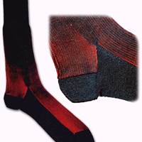 A man's sock knitted principally in black but with red behind which would show once the sock was stretched on the leg. The fronts are hand embroidered (chevened) with parallel rows of white spots. The back seam is handstitched. Marked 'A' for Allen, Solly & Co Ltd. There is also an oval label printed with the firm's London address (14 Moor Lane, Fore Street, London) and a description '1/1 black silk shot & emb.4441'