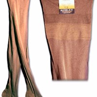 Fully fashioned stockings with French feet in tan silk. The deep welts have a shadow welt below and a crown-like 'M' for I & R Morley. The heel and the sandal foot are reinforced.