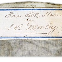 A woman's fine pink silk stocking made on a 52 gauge stocking frame. The heel, toe and English foot are of thicker silk. Marked below welt with 'M' for I & R Morley. It has a handwritten label 'Fine Silk Hose by I & R Morley'. The stains are from tar used to seal the bottle which contained it and a quantity of lace when they were buried under the foundation stone of the Wesleyan Chapel, Mansfield Road, Nottingham. They were recovered when the building was demolished in 1977.