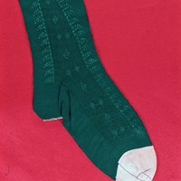 The black (now turned a dark shade of green) is probably the fast dye invented by William Elliot of Nottingham in the mid 18th century. The white tops and toes show that the black will not run into the white. The stocking has a lace clock with lozenges of plain knitting and 'chevening' or hand embroidery on the lozenges and around the clock. Marked 'C' below the welt. One of a collection of historic stockings exhibited by J R Allen at the Great Exhibition in 1851 and the International Exhibition in 1862.