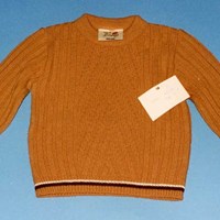 Child's long sleeved jumper in light brown rib knit with diagonal pattern at centre front. Round neck, dark brown and white bands at cuffs and bottom. Ladybird label, age 2, height 36 inches, washing instructions. Made of Orlon (acrylic fibre).