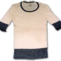Girl's short sleeved jumper, scoop neck with scalloped edge, wavy edge to sleeves. Knitted in white acrylic nylon boucle (yarn with a curled ply) with band of blue marl at neck, sleeves and bottom.