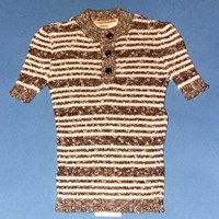 Child's short sleeved ribbed jumper with round neck and 3 button front opening. Blue marl and white bands. Label for 'Dee Minor' with washing instructions, age 2, height 36 inches, chest 20 inches, plus details of 6 month guarantee. Made in Courtelle, a brand of acrylic fibre yarn.