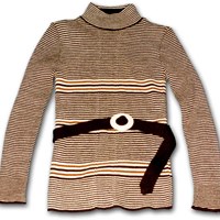 Girl's tunic or jersey with long sleeves, high collar, knitted belt. Knitted in narrow brown, tan and white bands with vertical detailing to centre front.