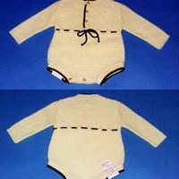 Child's lemon yellow romper suit knitted in horizontal fancy rib pattern with plain rib neck, cuffs, waist and leg holes. Opens at front to waist with 3 buttons, and at crotch with 3 buttons. Dark brown knitted drawstring at waist, matching edging. Made of Orlon (acrylic fibre).