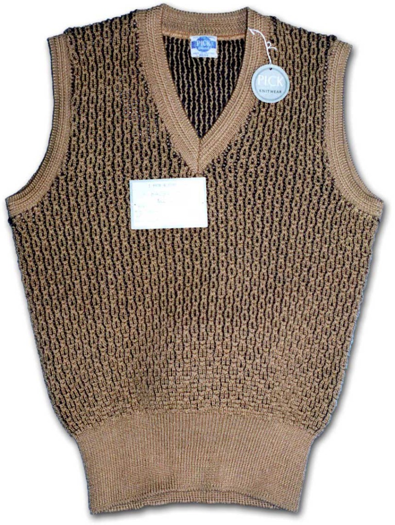 Men's knitted wool 'slipover' with a honeycomb pattern. V neck and armholes in fancy rib, waist in plain rib.
