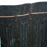 Women's stocking knitted in black silk lace stitch with additional hand embroidery. Repair to the welt has partially obscured the initials ME.