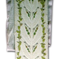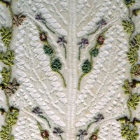 The lace pattern is made by a combination of hand transferred stitches and the use of a jack machine. The coloured silk embroidery of roses, oak leaves, acorns and violets is done by hand. Marked 'A...A' below the welt for the short lived partnership of Allen, Solly and Allen. From a collection of historic hosiery exhibited by J R Allen of Allen & Solly at the Great Exhibition in 1851 and the International Exhibition of 1862.