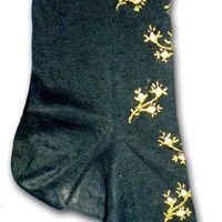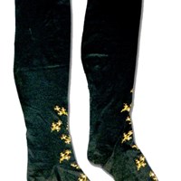 Pair of black silk stockings with embroidered rosebuds on the front in pink and gold coloured silk thread.