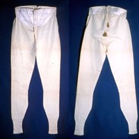 A pair of cotton stockinet long drawers in which each leg is made in one piece fashioned to the leg and with an inside leg seam. The waist is faced with silk taffeta which has cords sloping to the centre front and fastens with five buttons and buttonholes. They can be adjusted for fit by tasselled cords through four pairs of eyelet holes at the waist. There are long ribbed cuffs at the bottom of the legs.